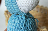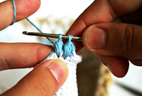 Меняем цвет нити на голубой и начинаем вязать узором «шишечки». Набираем 3 ВП подъёма, (3 СН провязываем вместе во вторую петлю), у нас получается первая шишечка, далее вяжем 24 такие шишечки. Отрезаем нить.