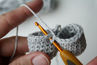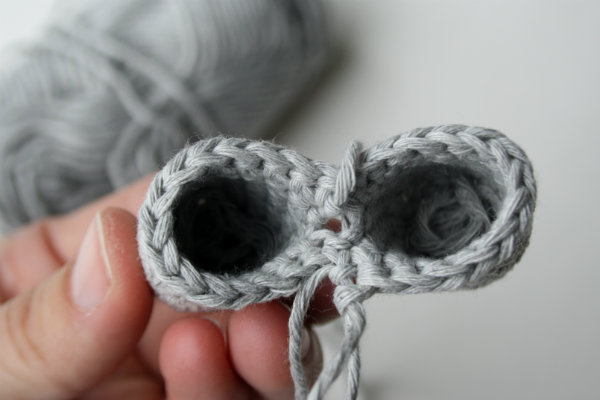 9: Соединяем обе ноги. Используем нить второй ноги и вяжем 15 сбн по первой ноге. Продолжаем 15 сбн по второй ноге. Отверстие между ног закрываем нитью с первой ножки.