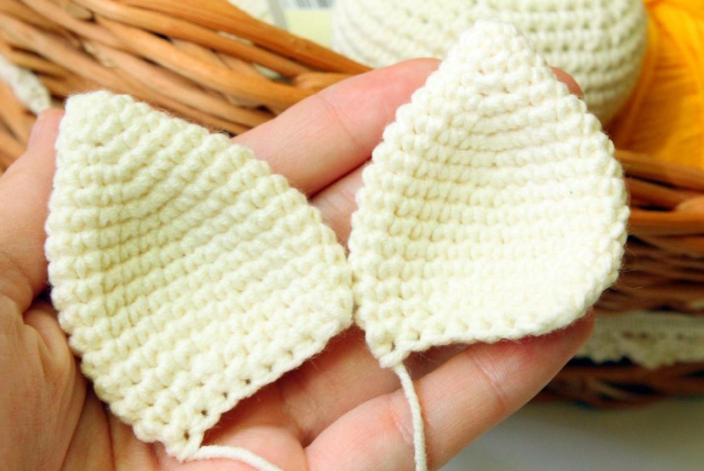 В кольцо амигуруми: 4 ВП подъема, 5 столбиков с двумя накидами, 4 ВП, соединительный столбик, 4 ВП, 5 столбиков с двумя накидами, 4 ВП, соединительный столбик. Пришиваем к голове.
