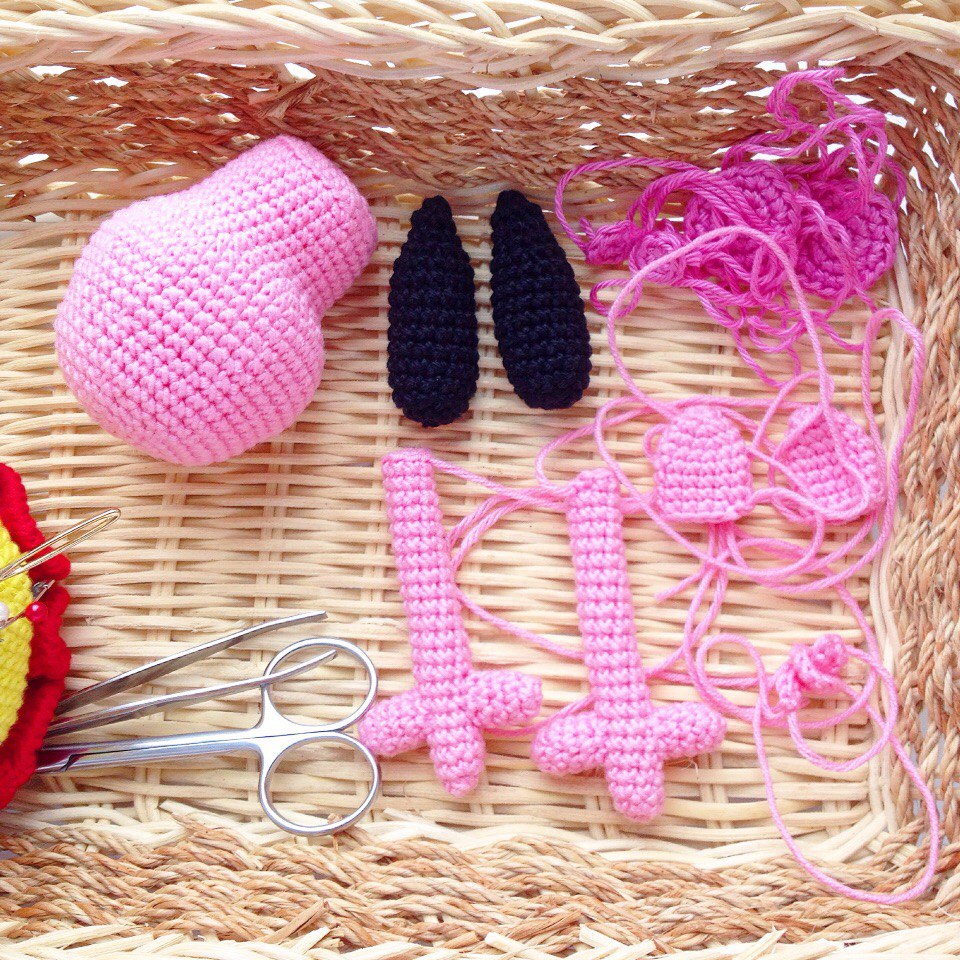3-22) 20 рядов без изменений (8), сс, узел, оставить длинный хвост для пришивания, нить обрезать.Пальцы: 4 шт. по спирали розовым цветом