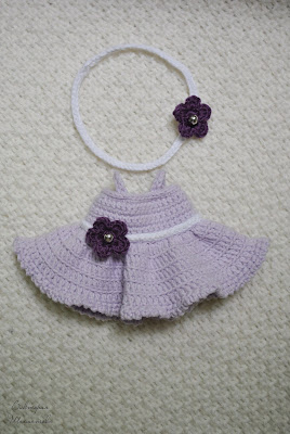 Поясок, лямочки и повязочку я вязала так: набирала цепочку вп нужной длины, затем со 2 петли от крючка сс до конца цепочки. Поясок и лямочки пришить к платью, повязочку замкнуть в кольцо.