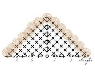 3. 2 вп подъема, 1 сбн в эту же петлю, 4 сбн, 3 сбн в 1 петлю, 4 сбн, 2 сбн в 1 петлю